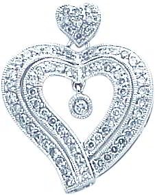 This is a beautiful new 14 karat white gold genuine diamond vintage style heart pendant. It is a great gift for yourself or a loved one and makes the perfect addition to any jewelry collection. STYLE- Cast METAL- 14K White Gold ORIGIN- China STAMPED- 14K SOLID/HOLLOW- Solid FINISH- Polished GEMSTONE- Diamond GEMSTONE QUALITY- AA is equal to I1 clarity and G-I color GEMSTONE WEIGHT- 0.51cttw APPROXIMATE LENGTH- 23.7mm (0.93") APPROXIMATE WIDTH- 18.8mm (0.74") APPROXIMATE WEIGHT- 2.5 grams