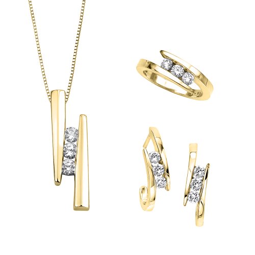 Celebrate the past, present and future with these three stone diamond jewelry set. An elegant finish for a chic, evening look, it showcases round brilliant cut diamonds set in 14k yellow gold. And at that price you cant resist it consists of ring weighs (1/4 ct.) pendant (1/4 ct.) with chain and Earrings in (1/4 ct.) (Ring- (Diameter - 0.83in,Width - 0.21in) Earring- (Width - 0.17in,Length - 0.66in) )