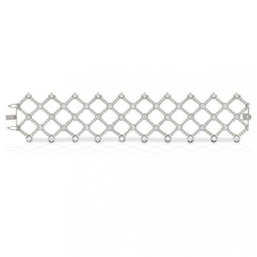 Positively breathtaking and perfect for your bridal party! This Bracelet is made of solid .925 sterling silver. This piece features an intricately-detailed patchwork design adorned with over 80 brilliant round-cut diamond CZs. Capable of fitting an 8-inch wrist, this item has significant weight. An interlocking tongue clasp with wing closures emphasizes beauty and function. This lattice bracelet is made with quality materials. Ultra-feminine. Sexy.