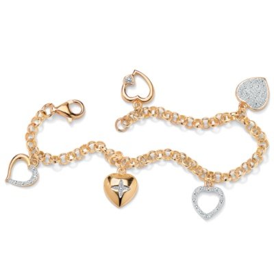 A bevy of heart charms sparked by a glittering diamond accent create a fashionably femme look for the romantically inclined fashionista. 7 1/4" length. 18k gold (40 mils) over sterling silver. Imported.. Palm Beach Jewelry Item 45812