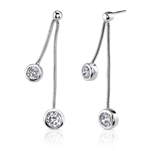 It is a night to celebrate; an occasion that comes just once, an opportunity to win or a moment to capture, and you need the perfect pair of earrings to bring it all together. These earrings epitomize all that is classic and modern and are delicately crafted in pure .925 Sterling Silver. The glowing Rhodium Plated Finish enhances the unique design and creates a lavish White Gold tone. The earrings feature smooth, gleaming studs that hold a cascade of dainty snake chains that flow into pools of glittering Bezel set 5mm and 6mm White Round CZ Diamonds. You get a unique design to tie-up you casual look, add bewitching appeal to a formal business style or just bring glitz and glam to your regular day. These earrings are designed for pierced ears and have easy-to-wear friction back, butterfly posts with stoppers to ensure safety. Dimensions: Length: 1 3/4 inches x Width: 1/2 inch and the combined weight of the earrings: 5.30gms. This includes a Money Back Guarantee, Gift Box and Free Shipping.