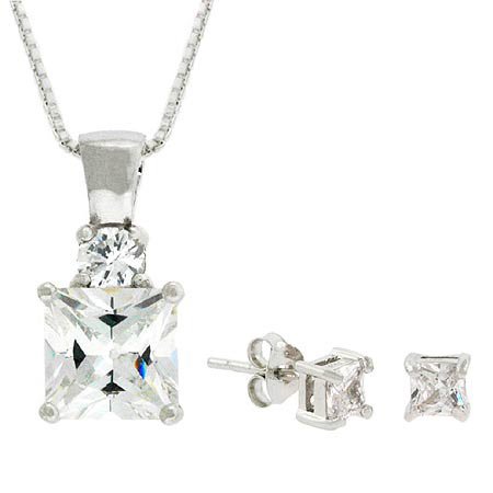 Simple elegance. A round diamond cz and square cz make a beautiful combination in this pretty pendant which is accented by square shaped cz stud earrings. Jewelry set makes a great additon.