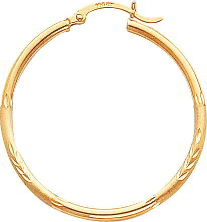This is a beautiful new pair of 14 karat yellow gold 2 mm (1/16") hoop earrings. They are a great gift for yourself or a loved one and make the perfect addition to any jewelry collection. METAL- 14K Yellow Gold ORIGIN- United States SOLID/HOLLOW- Hollow FINISH- Diamond Cut, Polished, Satin APPROXIMATE LENGTH- 36 mm (1 7/16") APPROXIMATE WIDTH- 34.5 mm (1 3/5") APPROXIMATE WEIGHT- 2 grams