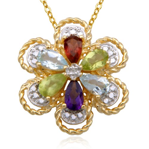 Match your colorful personality with this bright and cheery multi-gemstone flower pendant. Fashioned in gold-dipped sterling silver, it hosts six small pear-cut gemstones: two each of light green peridot and sky blue topaz, and one each of red garnet and purple amethyst. Rope and pave texturing plus a genuine diamond accent enhance this design. The pendant comes complete with an 18-inch chain.