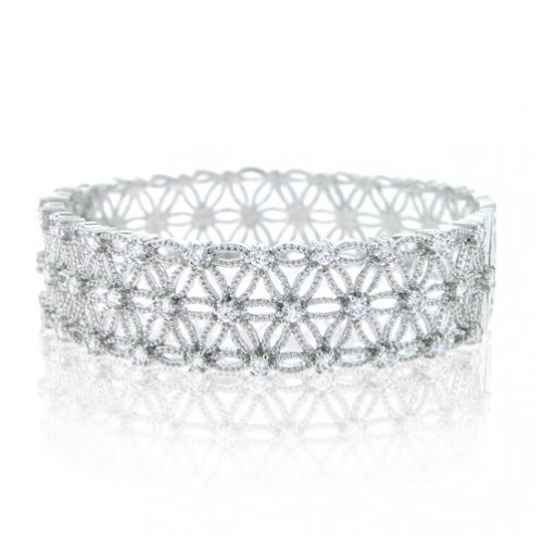Absolutely breathtaking and perfect for your bridal party! This Bangle Bracelet is made of solid .925 sterling silver. It features a finely-detailed, beaded vintage pattern adorned with over 30 dazzling round-cut diamond CZs. Through the process of filigree, its intricately eye-catching finish gives the appearance of stunning Victorian-era style. Capable of fitting an 8.25-inch wrist, this wide item has a delicate feel despite its heavyweight look. An interlocking snap clasp ensures maximum functionality. This fine bracelet evokes the elegance of days past, to make you feel youll be treasured forever.