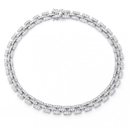 This slammin' designer inspired fashion necklace is made of sterling silver. It is 16 inches in length and has significant weight. This silver women's necklace has an off-the-hook square link design and is iced out with round cut diamond CZs. It also rocks an interlocking clasp to makes sure it won't fall off. Take glam to a whole new level. Different from a designer lookalike, this necklace is made with quality materials.