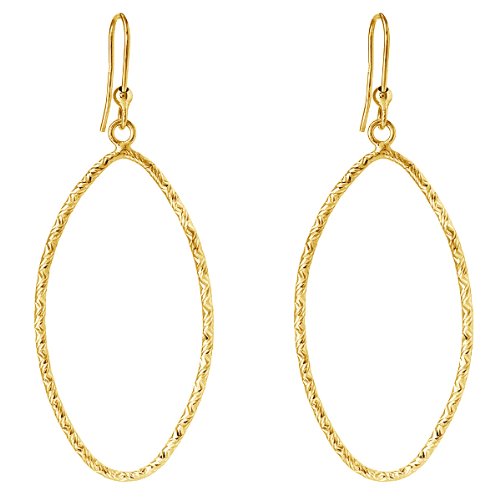 These large open oval dangle earrings are a fashionable accessory in radiant and durable 14 karat yellow gold. The slim ovals have a diamond-cut finish for enhanced texture and shine. Suspended from bead-tipped hooks, these beautiful gold earrings have plenty of movement and sway. They make any outfit extra chic.