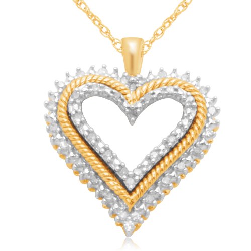 This fancy heart pendant sparkles with two layers of diamonds framing a layer of rope-textured gold. Offered in your choice of 10 karat yellow or rose gold, and embellished with 1/10 cttw of diamonds, it's a beautiful accessory. Enjoy this pendant with the 18-inch rope chain included, or add a different gold chain of your choice.